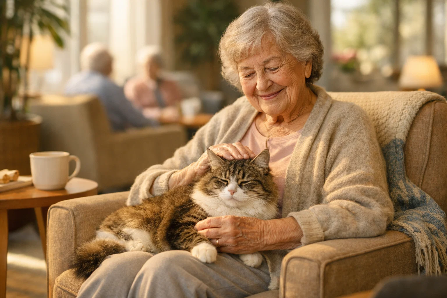 "When my mother moved to Whitcomb House, her biggest worry was leaving her cat behind. We were so relieved to learn that pets are welcome here! Whiskers has been such a comfort to her, and the staff absolutely adores him."
